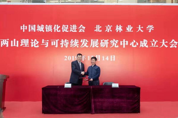 陈炎兵与安黎哲分别代表中国城镇化促进会、北京林业大学签订合作协议。