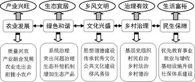 “产业兴旺”要求农业符合现代产业发展规律, 实现生产要素的高效组织和活力迸发, 在一、二、三产业融合发展中彰显现代产业的多重效益。“生态宜居”要求保护好乡村的生态环境, 这是乡村最大的资源禀赋和潜力所在, 通过健全基础设施和改善人居环境营造田园风情, 提高乡村对居民和游客的吸引力。“乡风文明”要求发展卫生文化教育等公共事业, 弘扬农耕文明和优秀传统, 用现代文明理念推进移风易俗, 提升农民素质和农村文明程度。“治理有效”要求创新农村社会治理, 通过自治激发农民主体活力、法治保障公平正义、德治营造和谐氛围。“生活富裕”就是要稳定农民收入来源、拓宽农民收入渠道, 让农民生活无忧、共同富裕。