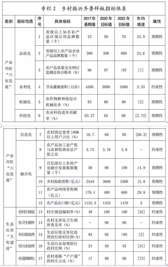 ——阶段目标:到2020年,乡村振兴取得重要进展,建成一整套齐鲁样板政策体系、制度体系、标准体系和考核体系;到2022年,乡村振兴取得重大突破,全省30%的村基本实现农业农村现代化;到2035年,乡村振兴取得决定性进展,基本实现农业农村现代化,齐鲁样板全面形成;到2050年,乡村全面振兴,农业强、农村美、农民富全面实现。