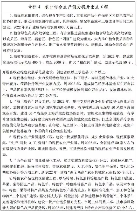(三)提高农业水利化机械化水平。大力实施农田水利工程,推进大中型灌区续建配套与节水改造,因地制宜兴建、提升中小型农田水利设施,打通农田水利“最后一公里”,加快建设现代农田灌排体系。发展节水农业、旱作农业,加快推广水肥一体化,加大地下水超采区综合整治力度。2022年基本完成35处大型灌区和一批重点中小型灌区续建配套节水改造任务,农业灌溉水有效利用系数达到0.646,有效灌溉面积达到8000万亩。围绕推进“全程、全面、高质、高效”农业机械化,调整优化农机装备结构布局,优先发展大马力、高性能、复式作业机械,大力发展智能化、高端农机装备。促进农机农艺融合,提高农机装备智能决策和精准作业能力,推进粮食机械化干燥,示范推广棉花机采、花生机播机收等关键环节技术,推动粮棉油等主要农作物生产全程机械化。加快推广林牧渔生产、病虫害防治、节水灌溉和农产品初加工机械化。2022年农作物耕种收综合机械化率达到88%。