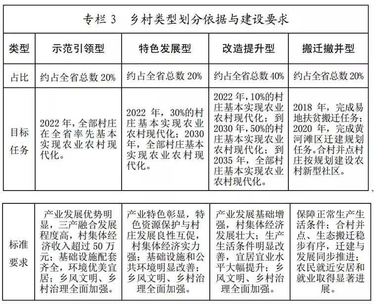 (一)示范引领型村庄。对资源禀赋丰裕、生态环境友好、产业支撑较强、地理位置优越、集体经济实力雄厚的村庄和城市近郊区村庄,应坚持高点定位,进一步增强产业优势、环境优势、竞争优势,高标准打造示范样板,即基础设施配置齐全,公共服务功能完善,村容村貌整洁有序,房屋建筑特色鲜明,农村环境优美宜居,民主管理制度健全,乡风习俗文明健康,特色产业优势明显,一二三产业融合发展,农村集体经济实力、人口和产业吸纳带动能力不断增强,农民生活幸福安康。到2022年,示范引领型村庄在全省率先基本实现农业农村现代化。