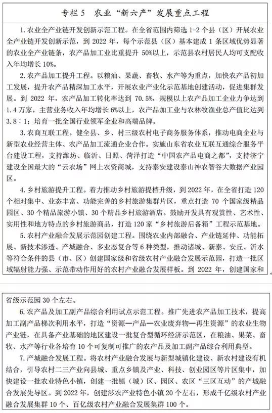 (五)打造农业“新六产”平台载体。深入实施农村产业融合发展“百县千乡万村”试点示范工程,开展农业“新六产”示范县、示范主体创建,带动形成一批百亿级、千亿级农村产业融合发展集群,创建一批国家级和省级农村产业融合发展示范园、先导区。促进产城融合发展,引导二三产业向县城、重点乡镇及产业园区等集中,打造一批农村产业融合领军企业,培育一批农业特色小镇和田园综合体。坚持产业园区、科技园区、创业园区“三园同建”,以园区化引领发展现代农业,融合发展关联产业,着力打造现代农业综合发展平台。到2020年,农业“新六产”对农民增收贡献率显著提高,建设农业“新六产”示范县50个、示范主体600家。2022年农业“新六产”发展布局基本成熟。