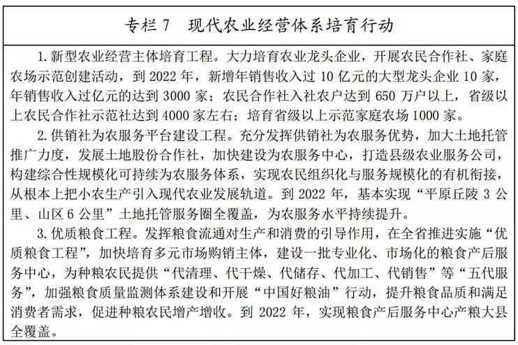 (一)延伸整合产业链。深化农业产业化经营,加快推动农业“接二连三”,促进立体化、复合式全产业链发展,推进不同类型农业产业链延伸整合,提升产业链整体竞争力。发挥农业龙头企业在全产业链布局中的关键作用,培育产业链领军企业,促进农业生产、加工、物流、研发和服务相互融合,推动产前、产中、产后一体化发展。强化农业生产性服务业对现代农业产业链的引领支撑作用,做大做强一批具有一定综合实力的农业服务业企业,构建全程覆盖、区域集成的新型农业社会化服务体系,带动农业产业链全面升级。培育和发展农商产业联盟、农业产业化联合体等新型产业链主体,打造一批产加销一体的全产业链企业集群。鼓励有条件的地方发展总部经济,引进国内外集团总部或区域总部,促进产业链条向高端延伸。到2022年,全省农产品加工业产值与农林牧渔业总产值之比达到3.8∶1。