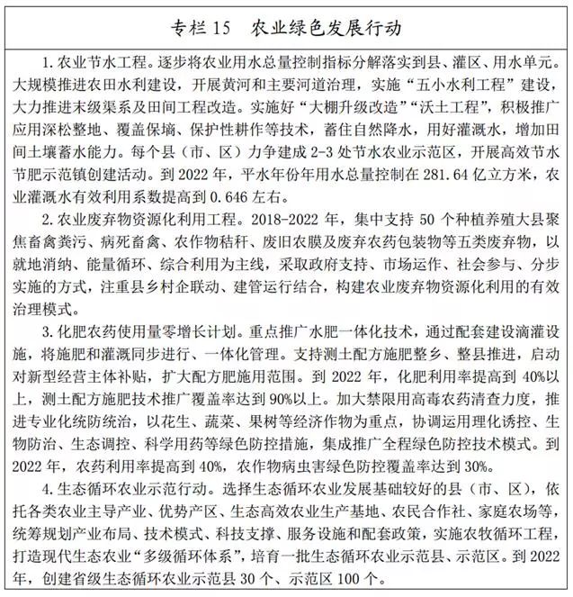(二)推进农业清洁生产。实施化肥、农药减量增效行动,全面推广测土配方施肥技术,强化化肥、农药、兽药、饲料添加剂等投入品使用管理,推进病虫害统防统治和绿色防控。大力实施种养业循环一体化工程,加快规模化畜禽养殖场区粪污处理设施建设与标准化改造,推动规模化大型沼气建设,散养密集区逐步实现畜禽粪便污水分户收集、集中处理利用,开展有机肥替代化肥试点。到2022年全省畜禽粪污综合利用率达到81%,规模养殖场粪污处理设施装备配套率达到100%。以县为单位推进农业废弃物资源化利用试点,推广秸秆高效利用模式,到2022年全省主要农作物秸秆综合利用率达到92%。推进废旧地膜、微灌材料和包装废弃物等回收处理,开展地膜使用全回收、机械化免膜生产、消除土壤残留等试点。创建一批国家农业可持续发展试验示范区。