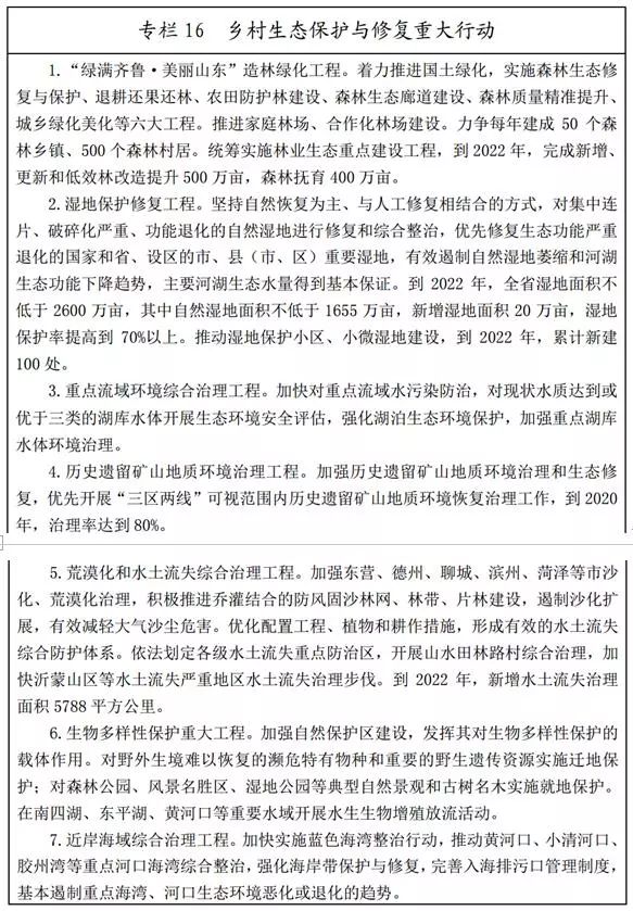 (二)实施生态修复重大工程。实施湿地修复工程,对集中连片、破碎化严重、功能退化的自然湿地进行修复和综合整治,有效遏制自然湿地萎缩和河湖生态功能下降趋势。开展沙化荒漠化治理,以东营、德州、聊城、滨州、菏泽五市为重点,积极推进乔灌结合的防风固沙林网、林带、片林建设。推进荒山、荒沟、荒滩整治修复。积极推进泰山山水林田湖生态修复国家试点工程。支持长岛海洋生态保护和持续发展。支持资源型城市开展生态修复工作,实施矿山环境治理恢复,持续推进采煤塌陷地治理。强化农业防灾减灾能力建设,提高抵御洪涝灾害、气象灾害等应急处置水平。