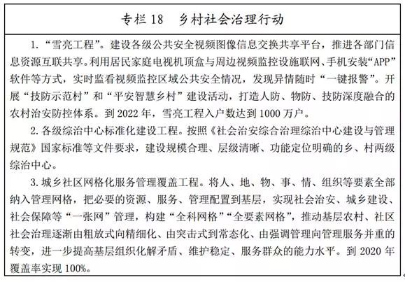 (三)全面推进平安智慧乡村建设。加强治安突出问题排查整治,深入开展扫黑除恶专项斗争,严厉打击农村黑恶势力、宗族恶势力,严厉打击黄赌毒盗拐骗等违法犯罪。依法加大对农村非法宗教活动和境外渗透活动打击力度,依法制止利用宗教干预农村公共事务。借鉴推广浙江“枫桥经验”,创新群众工作方法,健全完善村居、社区人民调解组织网络,全面推行智慧民调系统,善于运用法治思维和法治方式解决涉及群众切身利益的矛盾和问题。落实社区服刑人员、刑满释放人员管理制度,健全政府主导、社会参与、家庭扶持的帮扶机制,使其尽快融入社会,预防重新违法犯罪。加强反邪教、社区戒毒、严重精神障碍患者服务管理工作,对乡村留守老人、妇女儿童等强化服务教育,提高其自我防范意识和能力。强化网格化管理,深入实施“雪亮工程”,继续深化平安智慧村庄(社区)创建活动,构建人防、技防、物防深度融合的农村治安防控体系。强化乡村安全生产监管,防范各类事故发生。