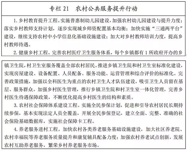 (三)实施数字乡村战略。综合运用多种技术手段,持续推进农村地区移动和固定宽带网络建设。引导移动、联通、电信和广电等电信运营企业加大农村网络建设投资,进一步提高农村地区光纤宽带接入能力,到2020年,农村家庭基本具备100M以上接入能力。加大对农村移动通信基站铁塔建设的支持力度,扩大4G无线网络覆盖范围,推动5G网络布局和商用进程,基本实现农村地区移动宽带网络人口全覆盖。落实农村地区网络提速降费政策,鼓励电信运营企业推出面向贫困户的网络资费优惠。建设信息进村入户平台,完善农村消费信息服务、市场信息服务、“三农”政策服务、农村生活服务等系统和手机APP,推进服务手段向移动终端延伸,服务方式向精准投放转变。推动远程医疗、远程教育等应用普及,建立空间化、智能化的新型农村统计信息综合服务系统,弥合城乡数字鸿沟。