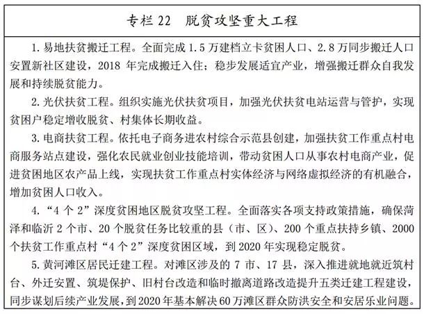 (二)聚焦深度贫困地区集中发力。加大对临沂和菏泽2个市、20个脱贫任务比较重的县(市、区)、200个重点扶持乡镇、2000个省扶贫工作重点村和黄河滩区等深度贫困地区的支持力度。以解决突出制约问题为重点,以重大扶贫工程和到村到户帮扶为抓手,新增脱贫攻坚资金、新增脱贫攻坚项目、新增脱贫攻坚举措主要用于深度贫困地区,着力改善发展条件,增强贫困群众发展能力,攻克深度贫困堡垒。加快推进易地扶贫搬迁,统筹推进黄河滩区居民迁建工程建设,推动居民安置、产业培育同步规划、同步实施,加强后续产业发展和转移就业,既让群众“挪穷窝”,也帮助其“拨穷根”,2018年全面完成易地扶贫搬迁任务,2020年基本解决60万滩区居民防洪安全和安居乐业问题。