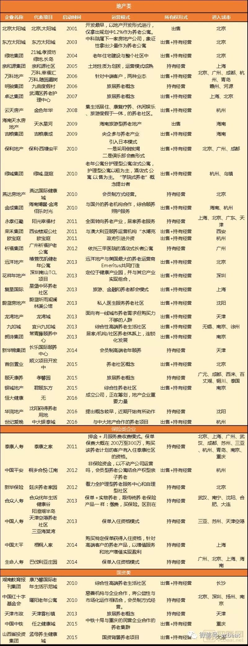 养老地产的主要参与机构被分为三大类:一类是实力雄厚,经验丰富的房企,如万科、保利、复兴、绿地等;二是手握大量资金的保险机构:如国寿、康泰人寿、生命人寿等;三是寻求产业布局或收益项目的社会资本:如红杉、云峰、和谐等。