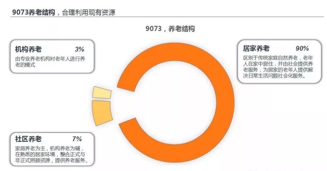 结合居民生活习惯与国情,早在2011年,民政部就在颁发的《社会养老服务体系建设“十二五”规划》中提出9073养老规划,即90%的老人居家养老,7%的老年人社区养老,3%的老年人机构养老。
