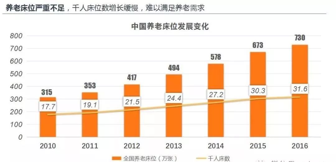 根据《2017社会服务发展统计公报》显示,我国目前千人养老床位31.6张,低于十二五规划提出的每千名老年人口拥有的养老床位数 35-40张,这意味着现阶段距离规划目标至少存在100万张以上的床位差距。