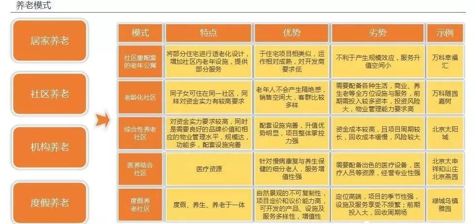 根据养老场景的不同,可以将养老地产的模式分为五类:社区配套型老年公寓、全龄化社区、综合养老社区、医养结合社区、度假养生社区。