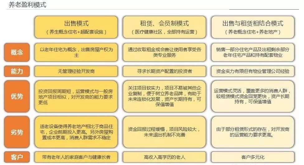 总的来说,养老地产的盈利模式可以被分为三种:出售模式、租赁或会员制模式、出售与租赁相结合的模式。