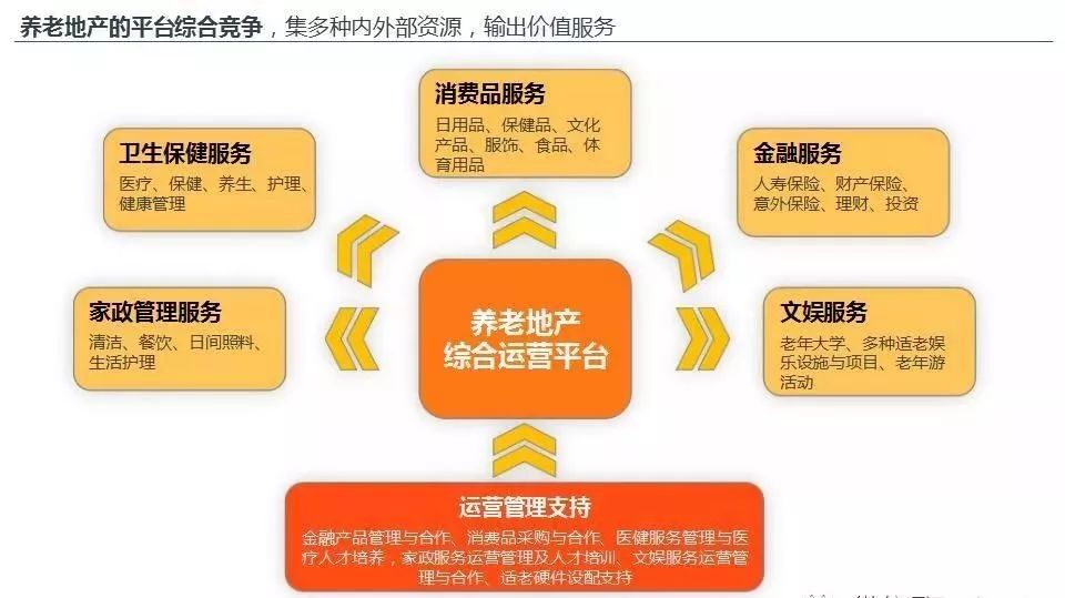 目前,大多数涉足养老地产的企业都在讲平台、讲产业,这主要是因为养老地产以医养结合的多元化价值服务为核心。