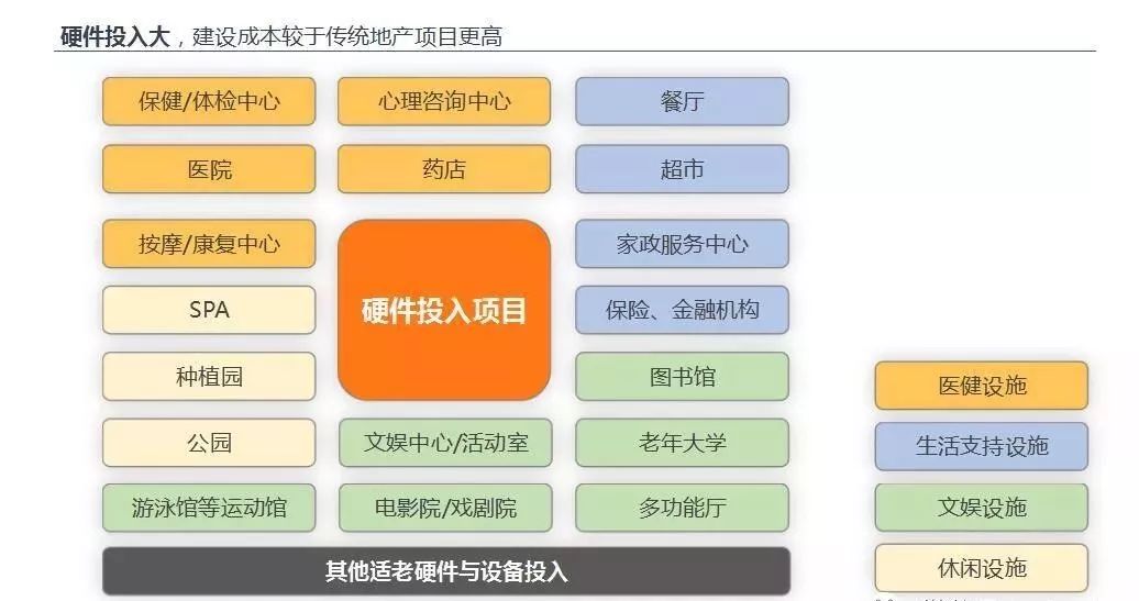 一般而言,养老设施的投资至少会为养老地产带来1000-3000元/平方米的成本增加。对于一个10万平方米的中型养老地产项目来说,会增加投资1-3亿元。