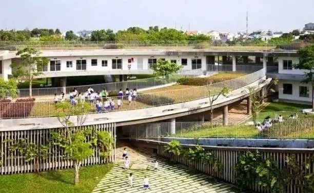 幼儿园位于胡志明市郊区,建筑设计很独特,它有个连贯的绿色屋顶,两端向地面倾斜,而后逐渐升高到两层楼的高度,形成一个层次与梯度不同的螺旋结构。而幼儿园所有的室内活动空间和相关设施都设在屋顶下方。