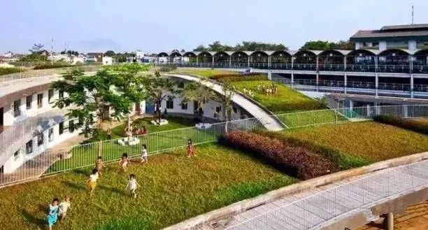 聪明环状设计,倾斜模式;幼儿安全,作物好长;建筑体透过连续的三重环形绿色屋顶,营造出三个内部操场,提供幼儿很安全又舒适的环境。从地面起步,到达屋顶非常容易,仅二层楼的高度,让孩童和教师到屋顶种植作物很轻松。这个设计让学校内部庭院,成为儿童安全的游戏空间。而屋顶,则开放儿童去体验自然生态,探索植物,学习种粮。