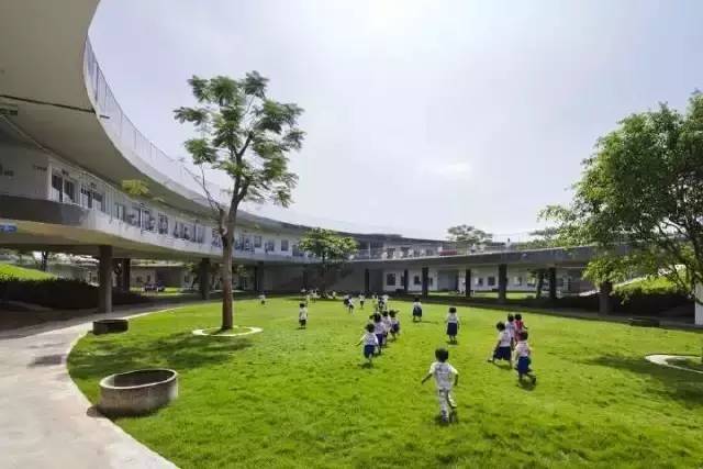 屋顶上铺有草坪,种植植物、蔬菜;三个环形又围成三个庭院,同样种有草地和树木。幼儿园占地面积很广,达到1.06 万平方米,可容纳高达500名学龄前儿童就读,可在草地上自在地奔跑、游戏,又能学习农业、参与到种菜中。
