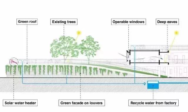 该建筑是由连续的狭长地带,两侧带有可操作的窗户,可以最大限度的交叉通风和自然采光。环形朝地面渐倾斜的设计,还有个极大优势,就是一旦下雨,地表水流会汇入两个大型储水箱中,可用于循环灌溉。还能保持土壤干燥不会因为积水而过于潮湿。