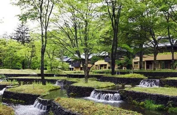 于是我们看到轻井泽虹夕诺雅所在地有高达30米的落差,在保护原有地貌风格的条件下,所有度假屋依地势而建,以开放的姿态拥抱自然,或是隐身于森林中的临山屋,或是亲近汤川的临水屋。