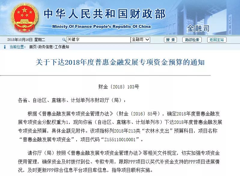 10月16日,财政部正式下达2018年度普惠金融发展专项资金预算的通知,向PPP项目发出一波总金额为23亿的锦鲤攻势。