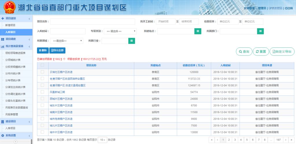 一是项目谋划精准化。依托在线平台建立“两库”(储备库和建设库)管理平台和重大项目谋划区,按照各地年谋划项目总投资达到上年度固定资产投资总额的两倍以上,谋划储备项目每年转化为建设项目的比例达到30%的要求,督促各地、省直各部门开展项目谋划,并按月调度、通报项目前期工作推进情况及建设情况,截至2018年10月,湖北省两库平台纳入各地谋划项目1.15万个,估算总投资9.1万亿元,重大项目谋划区纳入省直部门谋划项目1360个,估算总投资1.6万亿元。二是项目调度精准化。两库平台每月调度在建项目信息,截至2018年10月,纳入在建项目9288个,估算总投资4.96万亿元;通过重大项目建设监测管理系统,重点调度省级重点项目、10亿元以上新开工项目、省领导领衔推进重大产业项目进展情况,通过手机APP实时推送省领导。三是项目监管精准化。对接省公共资源交易平台、双随机一公开平台、信用平台等,对项目审批、招投标、建设等过程开展监管,审批人员可在项目基本信息页面直接查看项目单位信用信息,通过建立联合惩戒机制,对失信行为人实行惩戒。四是资金监管精准化。会同省人大建立省预算内固定资产投资项目管理平台,将省预算内投资计划安排项目全部纳入监管范围,每月关联项目代码调度进展情况,督促切实发挥政府资金效益。