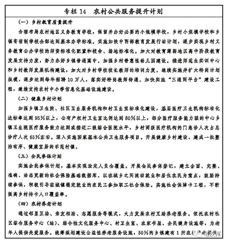 《乡村规划》第三十章主题是增加农村公共服务供给,指出继续把国家社会事业发展的重点放在农村,促进公共教育、医疗卫生、社会保障等资源向农村倾斜,逐步建立健全全民覆盖、普惠共享、城乡一体的基本公共服务体系,推进城乡基本公共服务均等化。