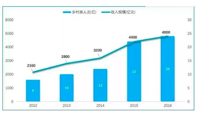 根据国家旅游局统计材料,2016年全国乡村游达到24亿人次,旅游收入4800亿元。而2017年全国乡村旅游达25亿人次 , 旅游消费规模超过1.4万亿元,旅游成为扶贫和富民新渠道。乡村旅游也是我国旅游投资的热点领域之一。2016年,全国乡村旅游类产品实际完成投资3856亿元,同比增长47.6%。截至目前,全国共创建休闲农业和乡村旅游示范县328个,推介中国美丽休闲乡村370个。