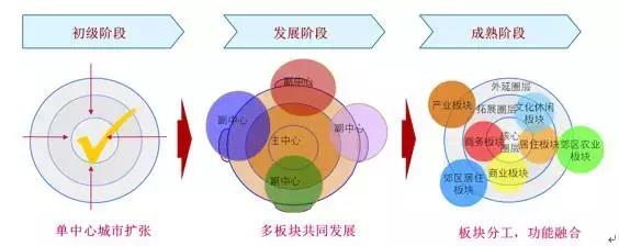 纵观现代城市的发展历程,大多会经历从单极发展到多板块发展的阶段,最终进入各板块分工明晰,功能不断融合的发展阶段。