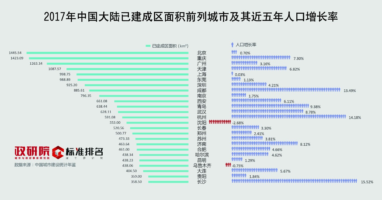 但人口流入和城区扩张如何保持一个适度的比值?就是一个科学问题。过去五年,全国城市建成区面积增长率约为17.49%,人口增长率约为13.44%,可见中国城市建设都趋向于“先建设、后引人”。