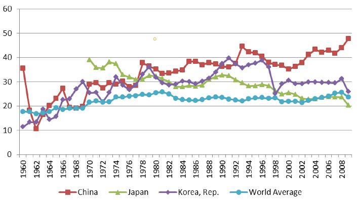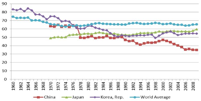 从中国的发展数据来看,中国的东亚模式是全世界经济发展模式比较极端的版本。根据世界银行统计数据,其中投资占GDP的比例的数据中,全世界均值是20-30%,日本韩国的占比为30-40%,中国的占比为40-50%(图1);与此相对应的内需即居民消费占GDP的比例的数据中,全世界均值为60-70%,日本韩国占比为50-60%,中国占比是40-50%(图2)。