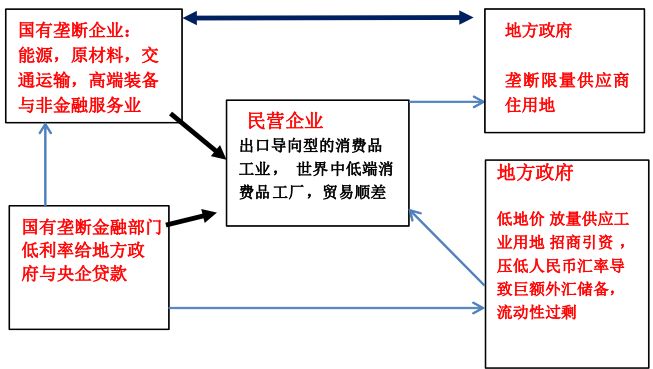 地方政府考虑的主要不是民营企业给他带来的直接的税收,也不是把制造业企业吸引过来政府官员就可以获得提拔,而是考虑到如果没有民营企业、制造业企业带来的产业投资就不会有对地方政府商业住宅用地的需求。那么主要是哪几拨人最早在买房买地?第一就是民营企业的管理层;第二就是当地的国有垄断的金融部门、国有金融的上游企业的这部分员工;当制造业企业发展起来后,就会有第三拨人;再加上地方政府的公务员和事业单位的人员。产生的这些住房建设、住房购买和商业消费都会给地方政府带来的税收、营业税的收入。此外还有商住用地出让金,地方政府通过垄断限量供应的商住用地来把最开始建设基础设施、搞工业开发区亏的钱赚回来,这就形成了一个资本循环的过程。