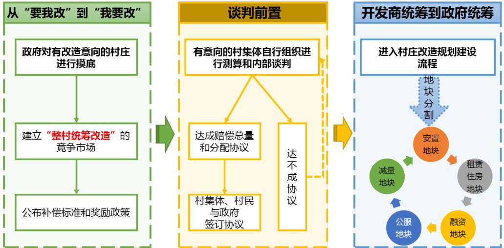 创新机制的关键就是在城中村改造过程中,把开发商获得城中村部分土地进行商住开发并缴纳土地出让金的过程,与在村庄剩余土地上利用开发商缴纳出让金并进行安置房、出租屋、产业用地建设过程进行区隔,最终实现高效率的整村统筹改造。这个模式可以有效的简化传统政府模式或开发商直接介入改造模式中的多方复杂博弈,最大程度上降低改造过程中达成交易所需时间、谈判成本与财务成本,全面加速改造过程。创新模式的具体流程如下。